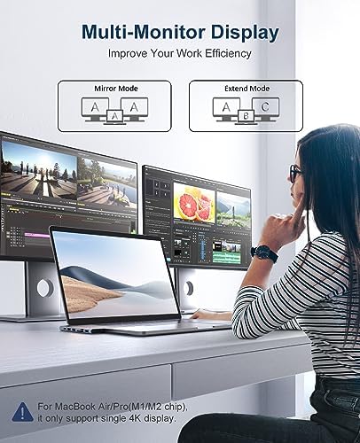 【Multi-Monitor Display:】The HDMI port supports a resolution of 4K@30Hz while the multi-function port supports 4K@30Hz.The Thunderbolt 3 port and HDMI port can be used simultaneously to mirror or extend the display of your laptop to your TV, monitor or projector.It supports dual monitors diaplay if you use the hdmi+TB3 port.(Note: For MacBook Pro/Air 2020-2023 (M1/M2 Chip), it does not support dual display).