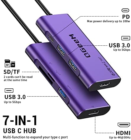 USB C Hub, QGeeM USB C to HDMI Adapter 4k, 7 in 1 USB C Dongle with 100W Power Delivery,3 USB 3.0 Ports, SD/TF Card Reader, Compatible for MacBook Ipad HP Dell XPS and More Type C Device