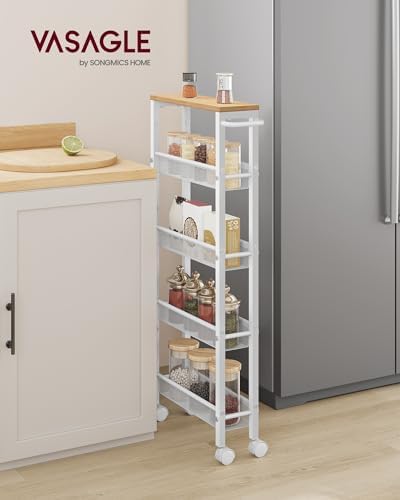VASAGLE Slim Rolling Cart, 5-Tier Storage Cart, Narrow Cart with Handle, 5.1 Inches Deep, Metal Frame, for Kitchen, Dining Room, Living Room, Home Office, Oak Beige and White ULRC034W09