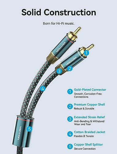 【Plug and Play】No software or drivers required! Simply connect two devices using VENTION’s 2RCA male to 2RCA male stereo audio cables. Enjoy high-fidelity non-destructive sound quality with ultra-high purity copper conductors, 24K gold-plated connectors, and double shielding that minimizes EMI/RFI interference.