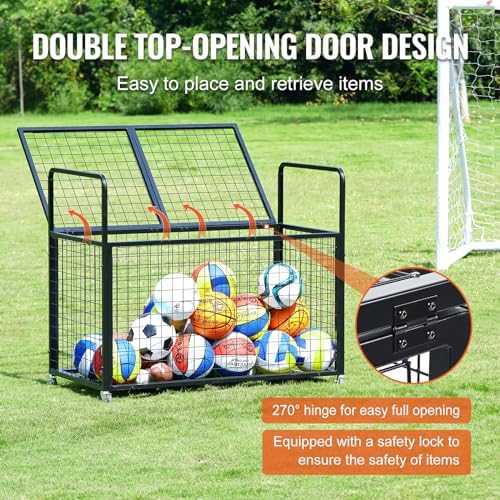 VEVOR Rolling Sports Ball Storage Cart, Lockable Basketball Cage with Double Lids, Sport Equipment Holder Organizer for Indoor Outdoor, Steel Storage Rack for Garages, Playgroup, Gym and Schools