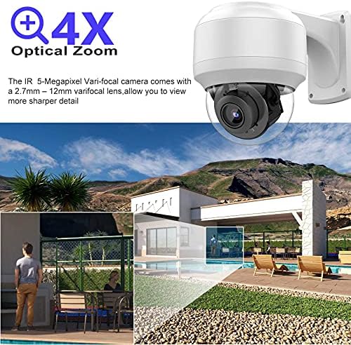 【5MP PTZ Security IP Camera】5MP@25fps 4MP@30fps resolution featuring the latest 1/2.8” 5MP progressive scan CMOS,come with 2 IR leds illumination can be captured clear images in low light or total darkness, up to 98 ft ultralong night vision distance; high speed Dome with Pan 0° to 355°/Tilt 0° to 90° to cover a much bigger vision range ,2.8mm~12mm Motorized Lens enables you to zoom into see more details of far-away objects without impairing image quality