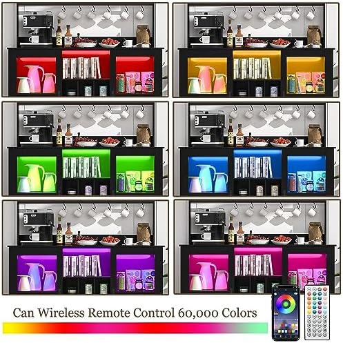 Vinctik 6&Fox Farmhouse LED Coffee Bar w/60000-color Lights,6FT Power Outlet,7 Hooks,9Wink Racks,Adjustable Shelf for Tea Liquor Wine.Black Cabinet Table w/Sliding Glass Door for Dining Living Room