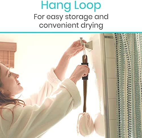 The curved, long reach handle is over 17” and is made of a durable lotus wood that will not split or crack. A nonslip textured grip wrap provides a comfortable and secure grip. Convenient for storage, the handle’s cord loop is large enough to slide on your wrist to prevent dropping while applying creams or lotions.