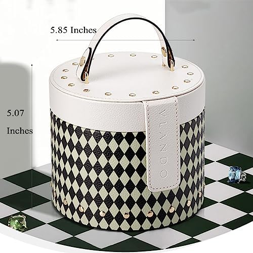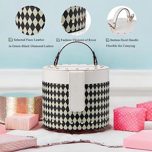 Vlando Travel Jewelry Organizer, Leather barrel-shaped Jewelry Box in Green-Black Diamond Lattice, Trip Accessories for Jewelry Organization
