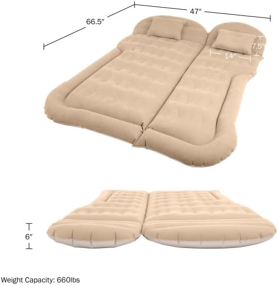 PRODUCT DETAILS – Materials: 25S PVC with Pile Coating. Dimensions: (L) 66.5” x (W) 47” x (H) 6”; Folded: (L) 13” x (W) 14” x (H) 5”; Pillows: (L) 14” x (W) 7.5”; Weight: 6.79lbs; Capacity: 660lbs. Inflatable Bed for Car Includes 2 Pillows. Color: Beige.