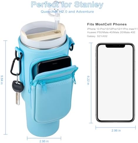 Multi Function – Shoulder Strap and Multiple Pockets, for Stanley Quencher 40 oz Cup Sleeve comes with a removable and adjustable padded shoulder strap, the shoulder strap can be easily adjusted between 27.5″ and 50″ to fit a wide range of body shapes. The water bottle holder for stanley 40 oz tumbler is designed with two front pocket designs that provide plenty of room for all your personal belongings such as smartphones, cash, cards,keys,etc.