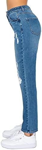 Relaxed style mom denim jeans with blown knee and distressing at the front. 5-pocket styling and a single-button and zipper fly closure.