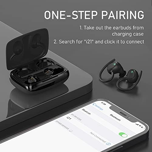 Bluetooth 5.1 Technology [2022 New] and One-Step Auto Pairing: Wireless headphones adopt advanced Bluetooth 5.1, which offers you an unparalleled audio experience with faster transmission speed, stronger connection stability, and longer range of bluetooth with no signal loss. Taken from the charging case, bluetooth earbud will be paired with each other automatically, and just select i21 on bluetooth list on your device to connect. In a matter of seconds, you are in euphonic music world.
