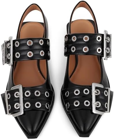 The ballet flats feature large metallic buckles with intricate eyelet details, adding a touch of sophistication to the design.