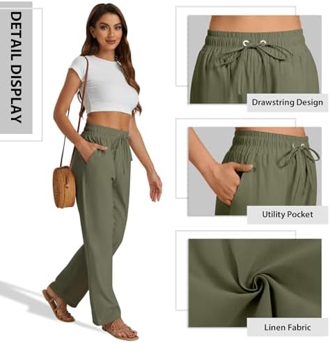 Womens Casual Linen High Waist Pants Drawstring Loose Fit Summer Pants Trousers with Side Pockets