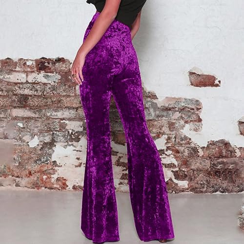Women’s Velvet Elastic Waist Flare Leg Palazzo Long Pants Ribbed Stretchy Slim Bodycon Bell Bottom Trousers for Women