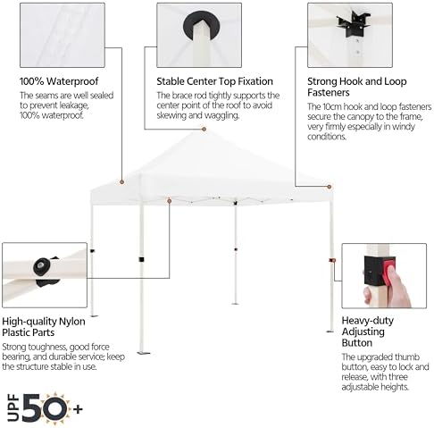 【3 Heights Switch Swiftly & Smoothly】With a simple press of the buttons on the legs, you can effortlessly set this pop-up canopy at 9.7′, 10′, or 10.3′, ensuring the perfect fit for various scenarios. Enjoy the flexibility and ease of use at your outdoor events, whether it’s a commercial gathering, wedding, or a party with family and friends.
