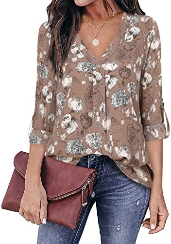 Youtalia Women’s 3/4 Cuffed Sleeve Chiffon V Neck Casual Blouse Shirt Tops