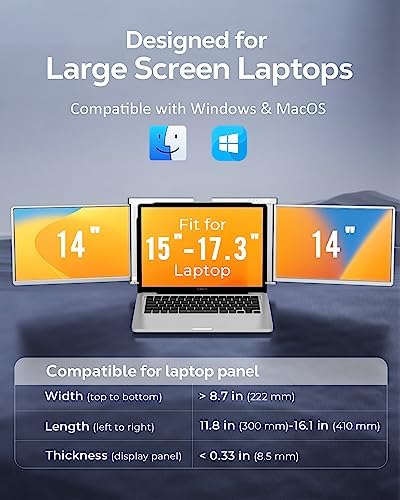 【Enhanced Compatibility】: The 14-inch triple portable monitor for laptop is specifically designed for larger laptops, perfectly suited for screen sizes ranging from 15 inches to 17.3 inches. It offers compatibility with various operating systems, including Windows, MacOS, and more. (Not Compatible with: Microsoft Surface series, Chromebook.) With its generously-sized screen, you can enjoy a remarkably comfortable and crystal-clear visual experience.