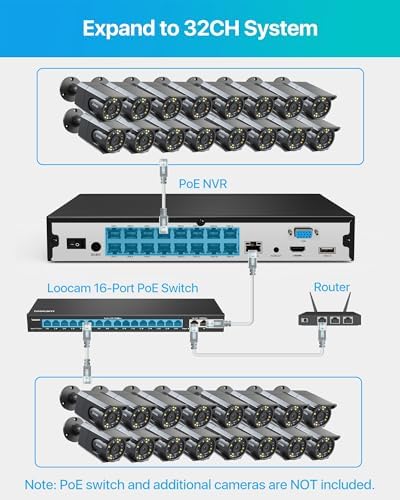 (5).[ Plug & Play 32CH Expandable 4TB PoE System ]__Embrace the convenience of PoE for effortless setup and stable connections. A single cable handles video, audio, and power for ZOSI PoE cameras, offering a more reliable solution than wireless. Easily expand this 16-Port NVR to 32 channels using an optional PoE switch (not included), accommodating up to 32 ZOSI PoE cameras.