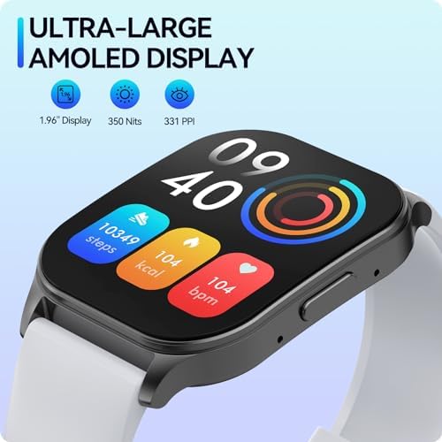 【Premium Quality Delivers a Superior Experience】1.96 inches AMOLED display 410*502 retina resolution and 350nits screen brightness Bring the ultimate visual experience and can see clearly in sunlight. High-quality metal curved watch body, clasp, Premium and durable. Express yourself with an collection of over 100 watch faces, or you can also personalize the watch face by your photos.