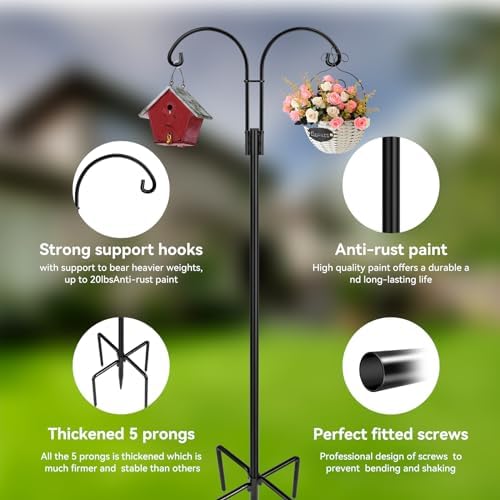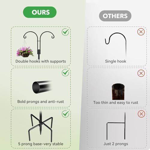 ➤【Bird Feeder Pole with 5 Prongs】This double shepherds hook adopts a 5-prong base design, upright posture while remaining firmly planted in the ground. It not only enhances stability but also improves load-bearing capacity