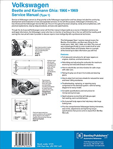 Just as the Beetle started a long tradition of Volkswagen automotive excellence, these are the manuals that created the Bentley reputation for clarity, thoroughness, and indispensability. Our air-cooled Volkswagen manuals provide both do-it-yourself owners and professional mechanics with clear explanations and illustrations, detailed service steps, and time-saving troubleshooting tips. This book features full wiring diagrams (including 6-volt systems), convertible top repair, carburetor rebuilding (30 PICT-1 and 30 PICT-2) and comprehensive specifications and troubleshooting tables for every year and model.