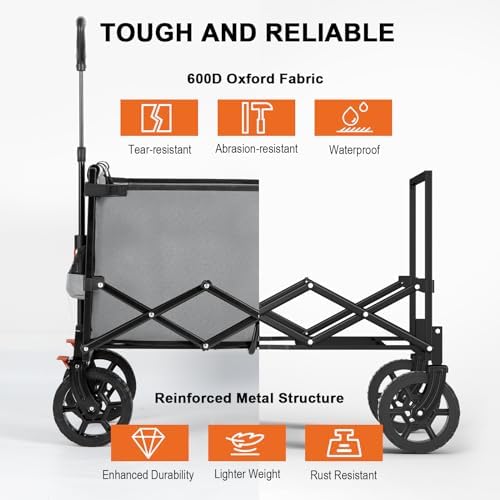 ▶Effortless Fold & Ultra-Compact Design: Say goodbye to tedious setups and cumbersome steps! Our innovative sliding sleeve structure makes folding a breeze. Just pull the middle strap and watch it collapse in a second. Thanks to the removable wheels, it’s difficult to find similar wagons with a smaller folded size yet larger capacity. Weighing just 20lbs, it’s perfect for one-handed carrying. No storage woes, no heavy burdens. Effortlessly store our ultra-compact wagon anywhere you like!