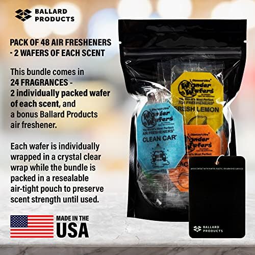 Bundle Contents – 48 pack of Wonder Wafer Car Air Fresheners – Strawnilla, Nu Car, lavender, Cotton, Black Royale, April Fresh, Baby Powder, Peach Mango, Mulberry, Island Breeze, Coocnut Cream, Wild Cherry, White, Pina Colada, Cinnamon Spice, Aqua Frost, Fresh N Clean, Strawberry, Clean Car, Creamy Vanilla, Mountain Pine, Fresh Lemon, New Leather, and Jasmine, 2 wafers of each scent and 1 Ballard Products air freshener