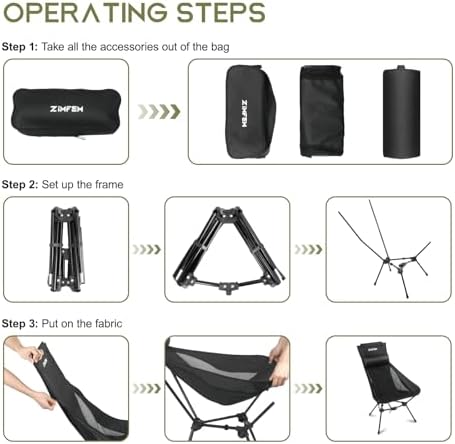 Effortless Assembly & Package List: Our camping chair is designed for easy setup – simply unfold the frame and slip on the fabric seat. Detailed instructions in the user manual are available for your reference, ensuring a quick and easy installation process. With just a few practice rounds, you can master the setup in under a minute! Our package includes a folding Chair (Assembly required) *1, Pillow*1, Storage bag*1, User manual*1
